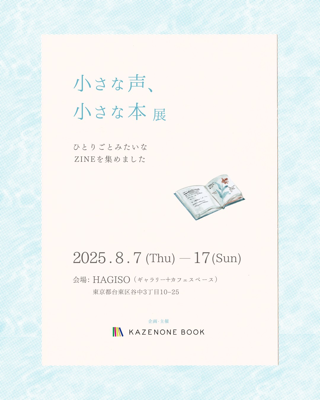 「小さな声、小さな本展」です。主催は、東京の荒川区・尾久を中心に活動する、ちょっとおせっかいな間借り本屋「KAZENONE BOOK」さん。店主の朝子さんとは、前回開催した「尾久、はじまりの本市」で仲良くなり、その後やりとりやランチデートを経て、今回お誘いいただきました。